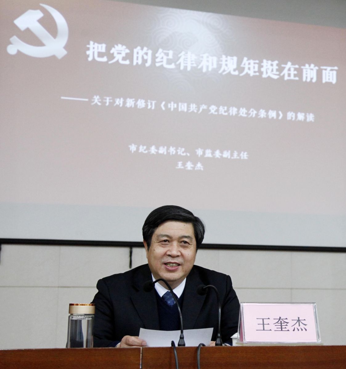 為了讓廣大黨員干部更好地把《中國共產黨紀律處分條例》學深悟透、融會貫通,12月21日,公司特邀市紀委副書記、市監委副主任王奎杰對新修訂的《條例》進行了專題解讀。市國資委黨委成員王懷東、公司領導、中層干部、關鍵崗位主管人員共100余人參加了學習。