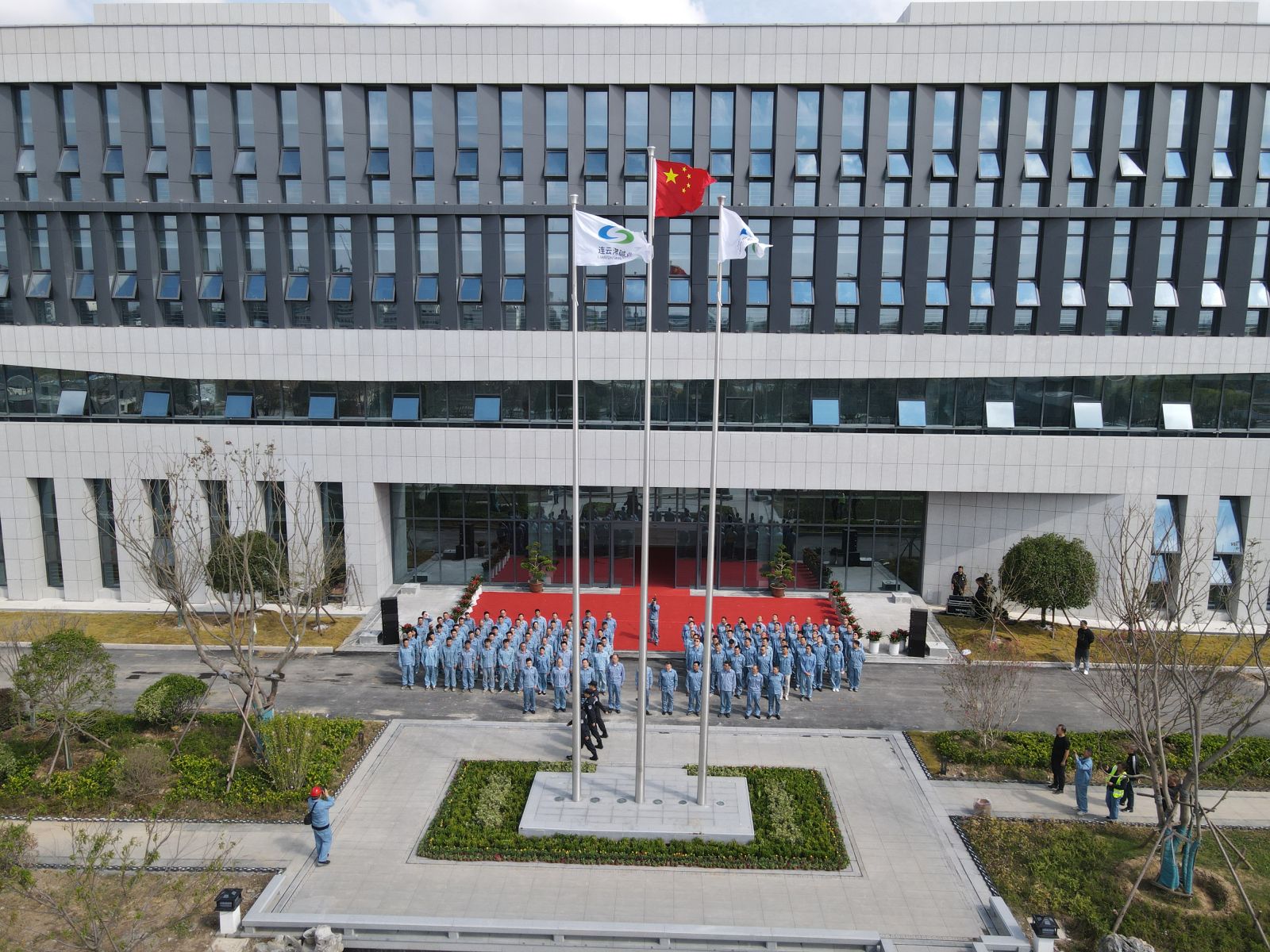 儀式伊始,公司在綜合樓前舉行莊嚴肅穆的升旗儀式,3名護旗手邁著鏗鏘有力的步伐,莊重地將國旗護送至升旗臺。伴隨著雄壯的《義勇軍進行曲》,五星紅旗冉冉升起。
